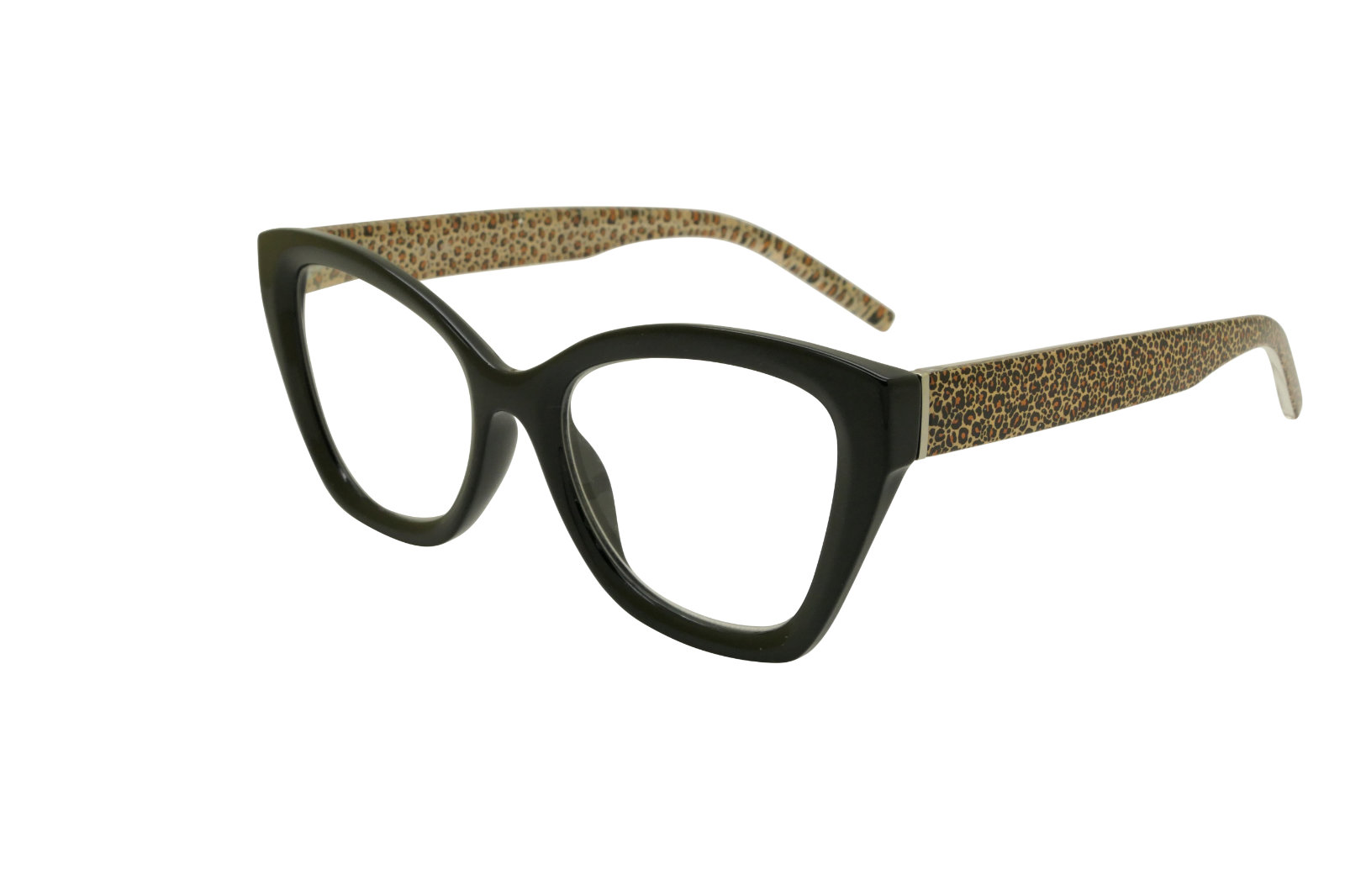 Large square cats eye frame with leopard print temples.